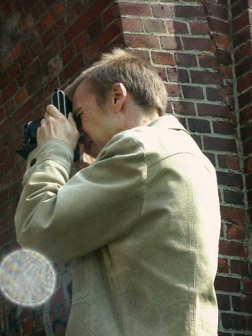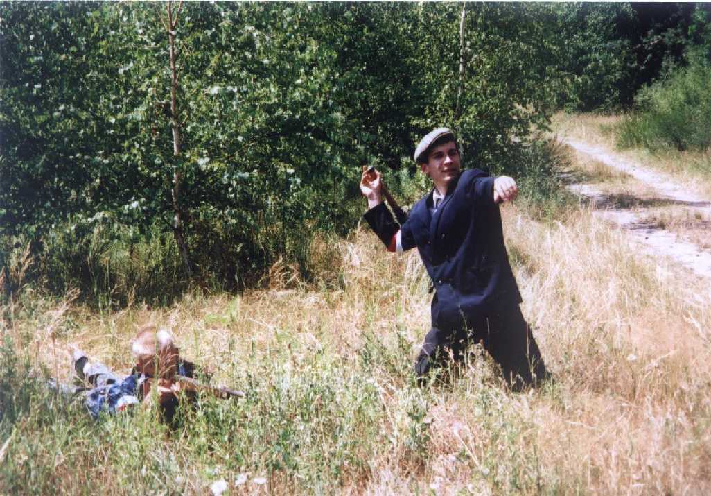 Scena rzutu granatem - wyprężył się jak jeleń. A gdyby bitwa toczyłaby się naprawdę już dawno dostałby kulkę. | Jedno z lepszych zdjęć.Jeżeli ktoś nie wie, jest to grymas spowodowany przedłużającym się szukaniem klucza. |