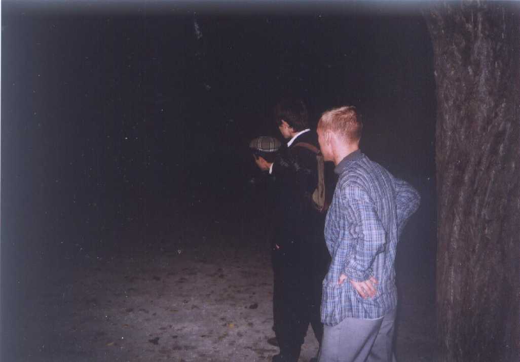 Tumany kurzu utrwalone na zdjęciu specjalnie wzbijaliśmy i jak widać osiągneliśmy efekt. | Trzeba mieć nierówno pod sufitem aby wpatrywać się z taką dociekliwością w ciemność. Ciekawe co sobie myślał przechodzień o przebrańcach póżną porą w parku. |